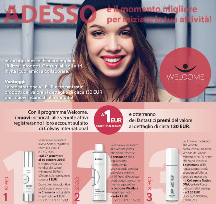 Con il programma Welcome, i nuovi incaricati alle vendite attivi registreranno i loro account sul sito di Colway International a 1€ e otterranno dei fantastici premi del valore al dettaglio di circa 120 €.